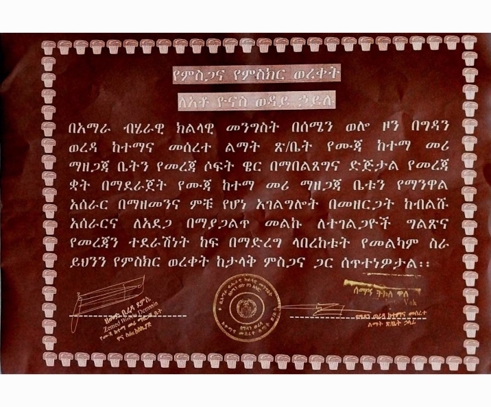 2ኛ. የሰሜን ወሎ ዞን ከተማና መሰረተ ልማት መምሪያ፣የግዳን ወረዳ ከተማና መሰረተ ልማት ጽ/ቤት፣የጋሸና ከተማ አስተዳደር ከ/መ/ል/ጽ/ቤት፣የዋድላ ወረዳ ከተማና መሰረተ ልማት ጽ/ቤት፣የአንጎት ወረዳ ከተማና መሰረተ ልማት ጽ/ቤት፣የሙጃ ከተማ መሪ ማዘጋጃ ቤት፣የአሁን ተገኝ ከተማ መሪ ማዘጋጃ ቤት፣የኮን ከተማ መሪ ማዘጋጃ ቤት እና ሌሎችም የግል እና መንግስት ተቋማትን ማመስገን ግዴታ ተገቢ ነው።