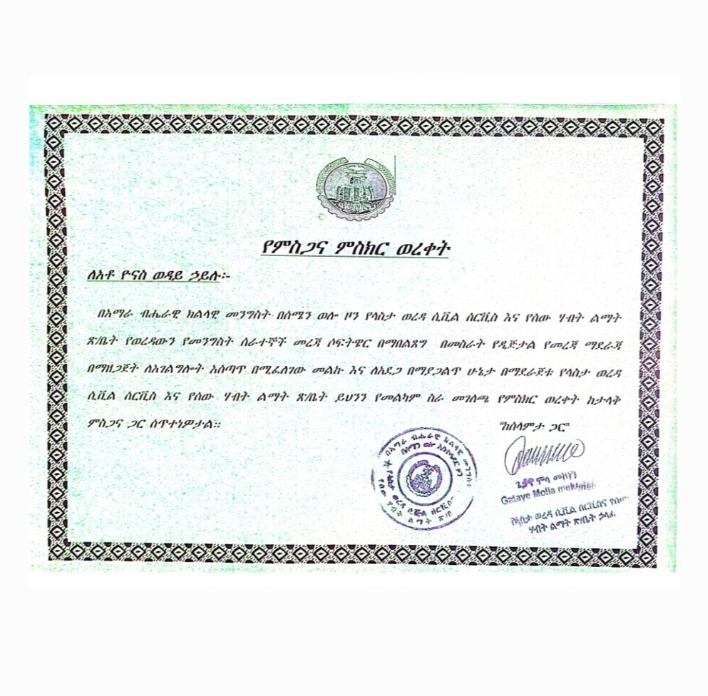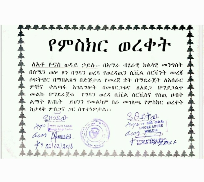 ለዚህ ስኬታማ ስራ ያበቃን የመንግስት እና የግል ተቋማት ላደረጉት የማበረታት፣የምክር፣የሽልማት እና በገንዘብ ሊመዘኑ የማይችሉ እጅግ ብዙ ነገሮችን ለተራዱት ግለሰብ እና ተቋማት ላቅ ያለ ምስጋና እናቀርባለን። በዋናነት ከመንግስት ተቋማት መካከል 1ኛ. ከሲቪል ሰርቪስ ተቋማት(የግዳን ወረዳ፣የሰሜን ወሎ ዞን፣የላስታ ላሊበላ ከተማ አስተዳደር፣የላስታ ወረዳ፣የሃራ ከተማ አስተዳደር) ሲቪል ሰርቪስን